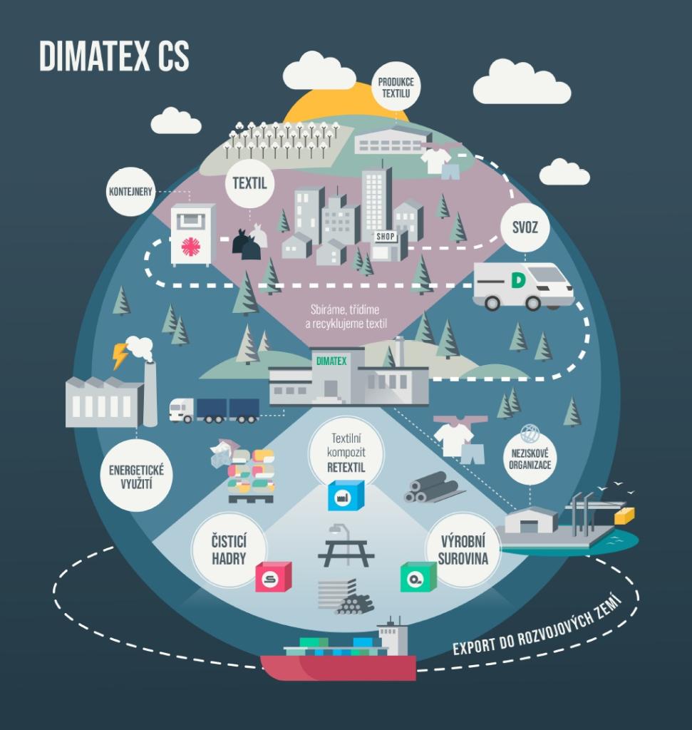 Z odpadové části textilu Dimatex vyrábí textilní kompozit Retextil – profily a městský mobiliář (lavičky, kryty na kontejnerová stání, plotovky, kompostéry a další). Tento materiál kombinuje nejlepší vlastnosti dřeva a plastu – je neabsorpční (odolný proti vlhkosti, vodě a nízkým teplotám), odolný (o 40 % mechanicky odolnější než srovnatelné plasty), recyklovatelný (z 95 % složen z recyklovaného materiálu – textil a LDPE fólie).
