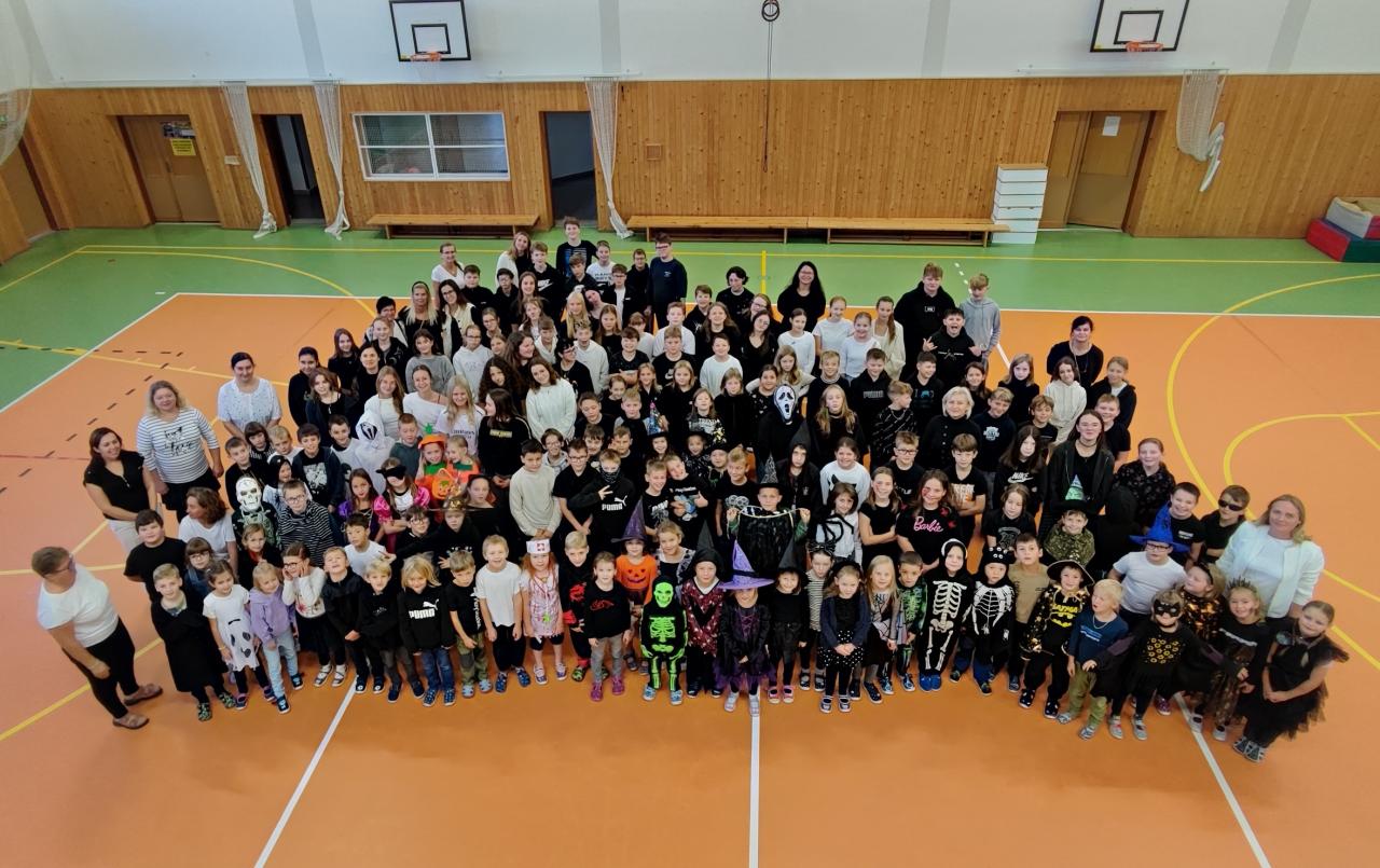 Nakonec jsme vyhlásili rekord v počtu stejného oblečení, a to černého nebo bílého a připojili jsme i halloweenské masky. Kdo byl takto oblečený, přišel o přestávce mezi 3. a 4. vyučovací hodinou do tělocvičny, kde jsme se všichni vyfotili. Děkujeme tak všem spolužákům i učitelům, kteří se k nám připojili a v úctyhodném počtu 164 osob (což víc než půlka školy) se nechali zvěčnit na společné fotografii.
