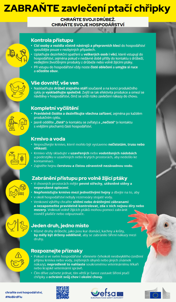 V souvislosti se zhoršenou nákazovou situací upozorňuje Státní veterinární správa na vysoké riziko dalšího šíření nákazy vysoce patogenní ptačí chřipky (HPAI) subtypu H5N1. Státní veterinární správa zároveň upozorňuje na důležitost zavést preventivní opatření biologické bezpečnosti v chovech drůbeže a ptáků chovaných v zajetí, viz leták EFSA v příloze.