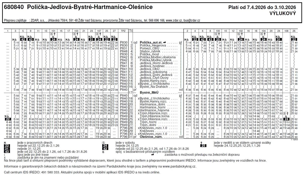 Z tohoto důvodu vydal mimo jiné výlukový jízdní řád Polička-Jedlová-Bystré-Hartmanice-Olešnice platný od 7. 4. 2026 do 3. 10. 2026.