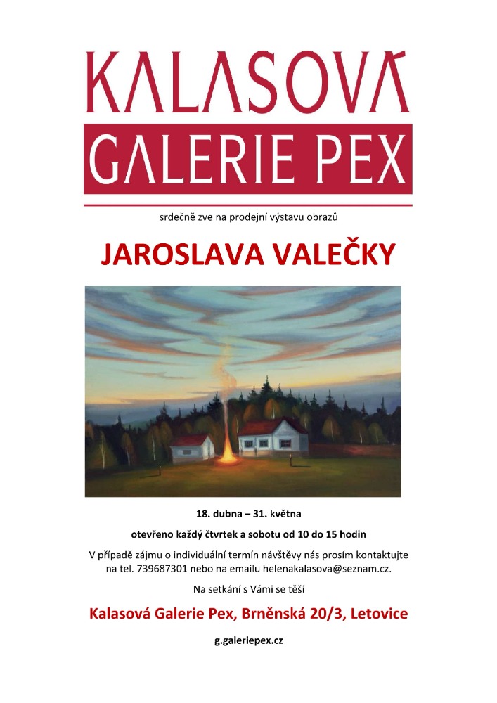 Dovolujeme si Vás pozvat na prodejní výstavu obrazů malíře Jaroslava Valečky do galerie Kalasová galerie PEX v Letovicích, která probíhá od soboty 18. dubna do konce května.