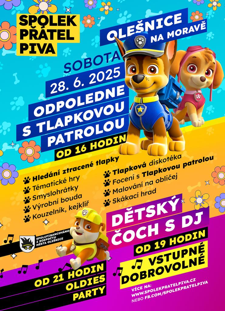 Srdečně vás zveme na ODPOLEDNE S TLAPKOVOU PATROLOU, které pokračuje DĚTSKÝM ČOCHEM a vyvrcholí tradiční OLDIES PARTY! Čeká vás zábava pro malé i velké, rodiče i prarodiče! ![]()