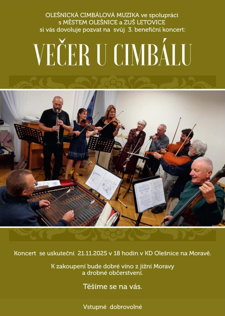 Olešnická cimbálová muzika Vás s městem Olešnice a ZUŠ Letovice zve na 3. benefiční koncert Večer u cimbálu, který se uskuteční v pátek 21. 11. 2025 od 18:00 v Kulturním domě v Olešnici.
