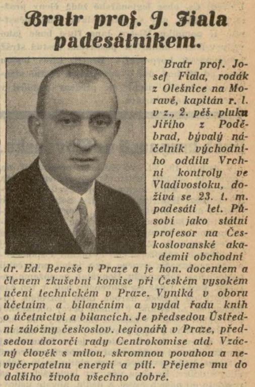 Prof. Josef Fiala se narodil 23. června 1888 v Olešnici na Moravě. Byl jedním z nejvýznamnějších českých odborníků v oboru účetnictví a podnikové ekonomie v první polovině 20. století. Jeho učebnice formovaly celé generace československých odborníků.